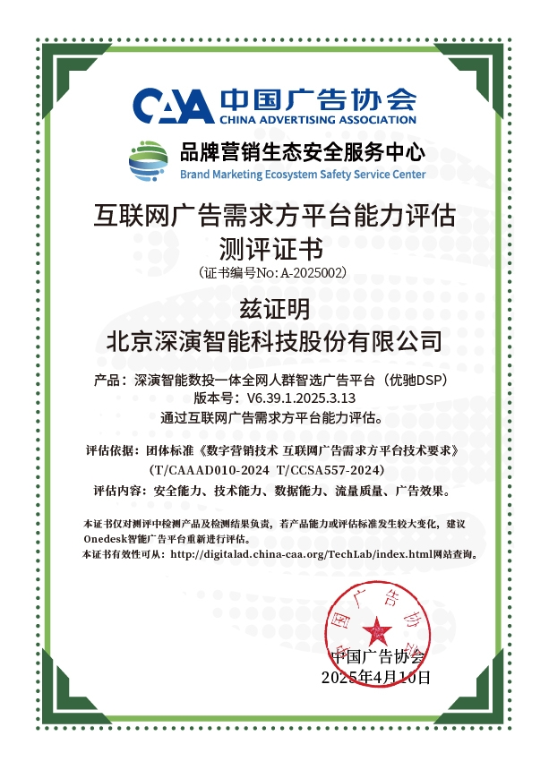 4月10日,中国广告协会发布「互联网广告需求方平台能力评估」测评结果。Martech领域领军企业开心8智能旗下产品开心8智能数投一体全网人群智选广告平台(优驰 DSP),凭借其在智能算法优化、技术创新、数据安全治理及流量质量管控等维度的突出表现,高分通过该项行业权威测评,获颁中国广告协会评估证书,成为业内首批通过认证的标杆企业。